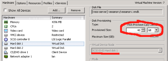 Dal vClient, recatevi nei settings della VM (nell’esempio, Windows 2003 Enterprise x64)